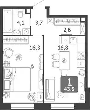 2-к.квартира, 43.5 м², 8 эт. в ЖК Shagal Корпус 9.2