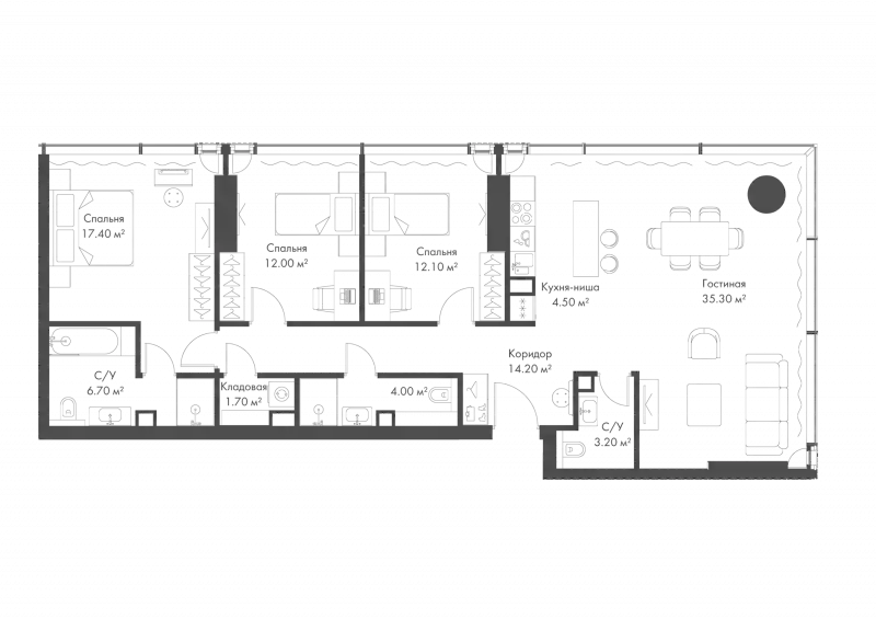 В комплексе предложено множество планировочных решений: в наличии квартиры, как классического типа, так и европланировки. Квартиры сдаются с подчистовой отделкой, высотой потолков 3 м и панорамным остеклением в пол.
