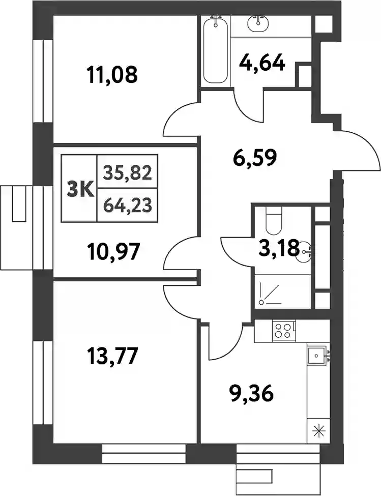 18 140 259 ₽3-к.квартира, 68.08 м², 3 эт.