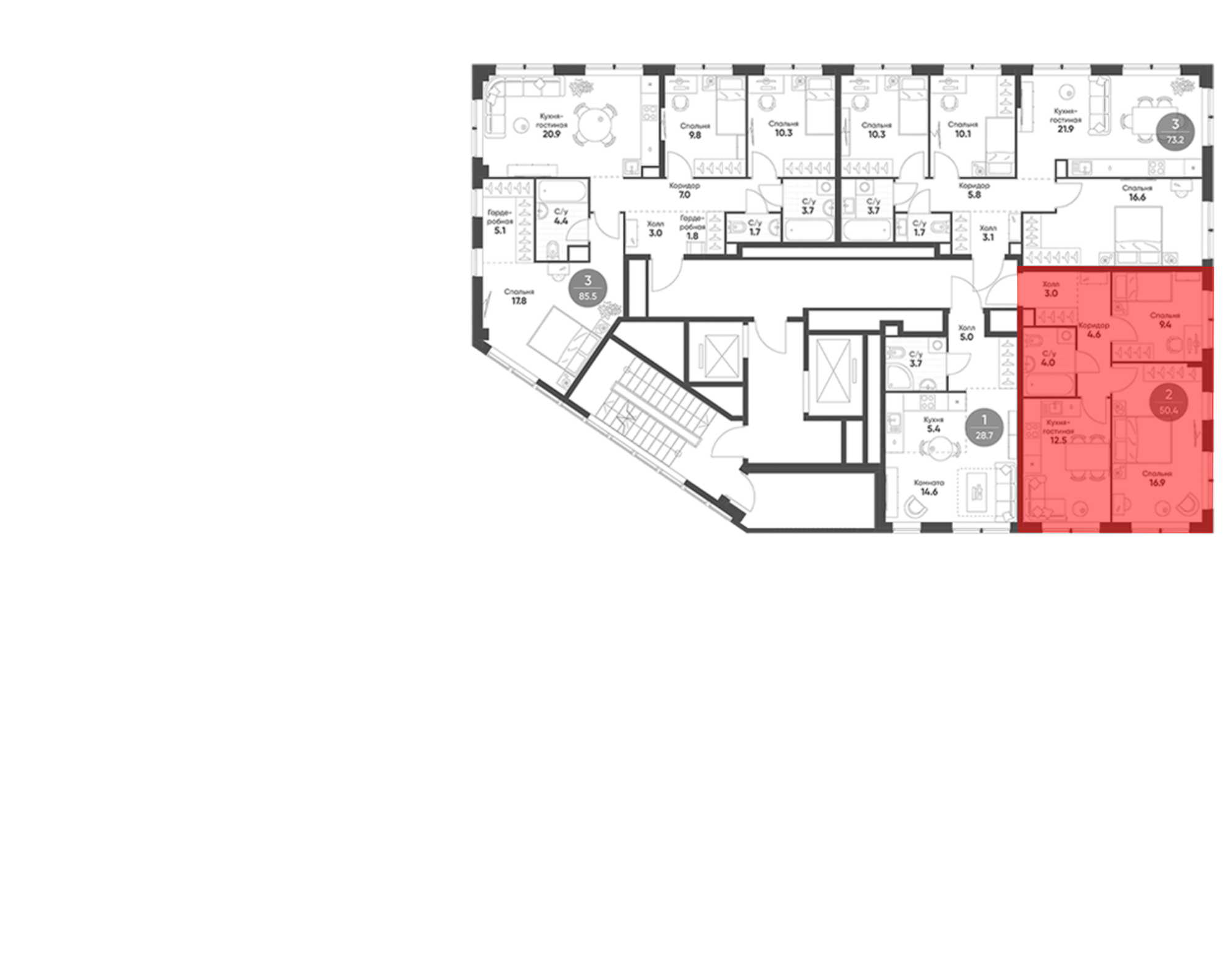 В проекте представлены разнообразные варианты планировок: от уютных однокомнатных площадью от 28,1 квадратных метров до просторных 3-комнатных площадью 88,9 метров. Также в ассортименте имеются квартиры с угловым остеклением и широкими панорамными окнами. Высота потолков варьируется от 2,87 до 3,30 метров. Все квартиры сдаются без отделки.