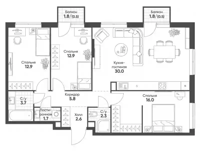 В проекте представлены разнообразные варианты планировок: от уютных однокомнатных площадью от 28,1 квадратных метров до просторных 3-комнатных площадью 88,9 метров. Также в ассортименте имеются квартиры с угловым остеклением и широкими панорамными окнами. Высота потолков варьируется от 2,87 до 3,30 метров. Все квартиры сдаются без отделки.