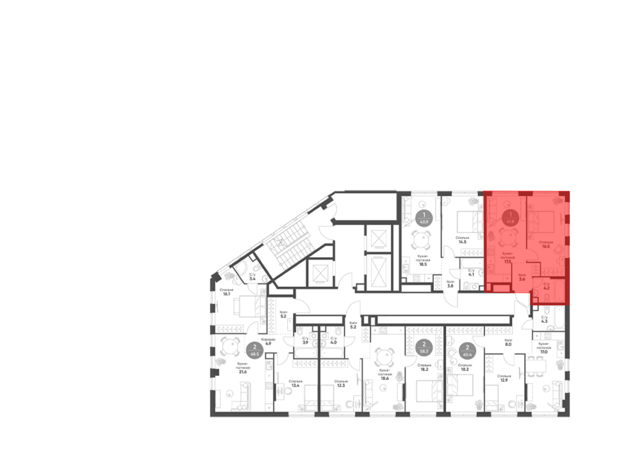 В проекте представлены разнообразные варианты планировок: от уютных однокомнатных площадью от 28,1 квадратных метров до просторных 3-комнатных площадью 88,9 метров. Также в ассортименте имеются квартиры с угловым остеклением и широкими панорамными окнами. Высота потолков варьируется от 2,87 до 3,30 метров. Все квартиры сдаются без отделки.