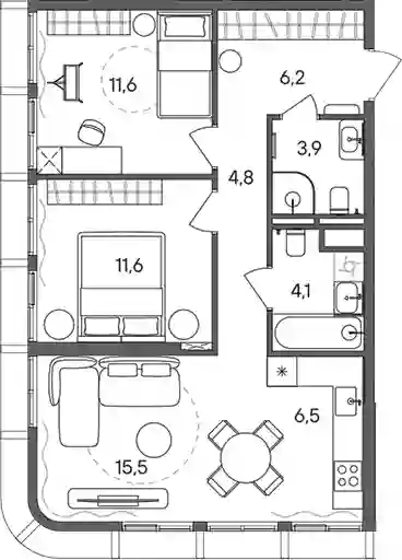 В жилом комплексе доступен широкий выбор планировочных решений: от студий до квартир с 4 спальнями площадью от 21,5 до 135 кв. метров. Есть планировки с мастер-спальней, угловой кухней-гостиной, большой детской комнатой и просторными гардеробными. На верхних этажах башен квартиры имеют панорамное остекление. Из окон открываются виды на панораму города и парк «Сокольники». Высота потолков составляет 3,1 метра. Все квартиры в комплексе сдаются без отделки.
