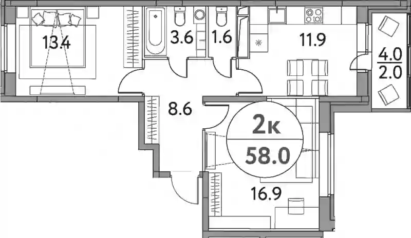 9 203 705 ₽2-к.квартира, 58.2 м², 14 эт.