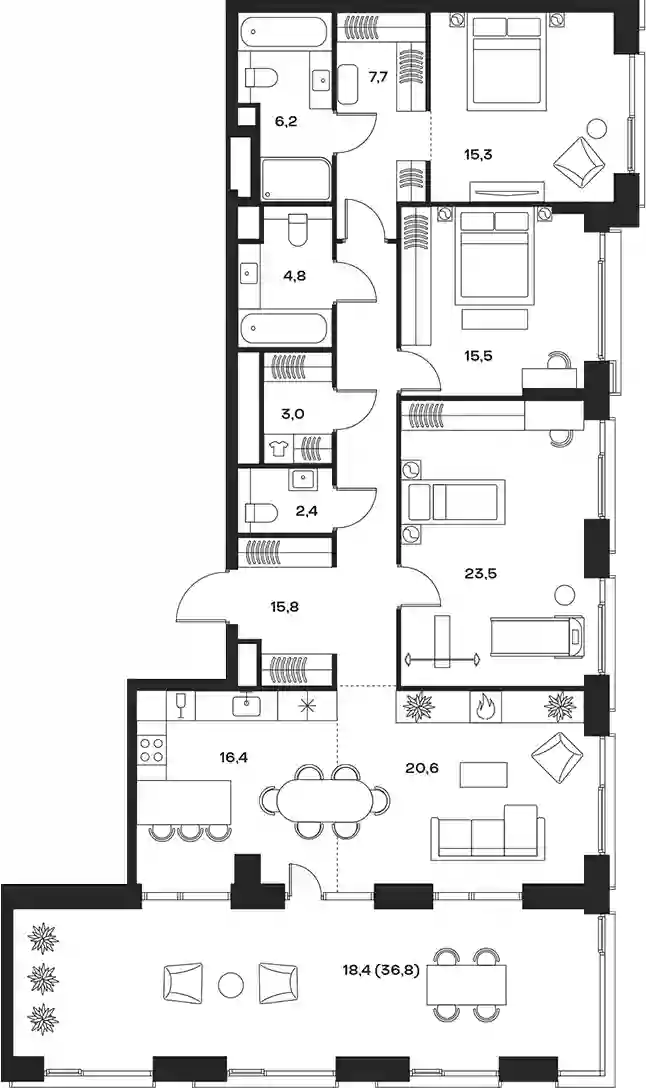 В комплексе предложен широкий выбор планировочных решений от компактных студий площадью 28 кв. метров до просторных пентхаусов с каминами площадью до 156 кв. метров. Также представлены редкие форматы квартир: с террасой, мастер-спальней и окном в ванной комнате. Уникальность проекта заключается в разнообразии типов остекления: в наличии 48 вариантов, включая джабо-окна, французские балконы и эркеры. Высота потолков составляет 3,1 метра, а в пентхаусах достигает 3,6 метра.