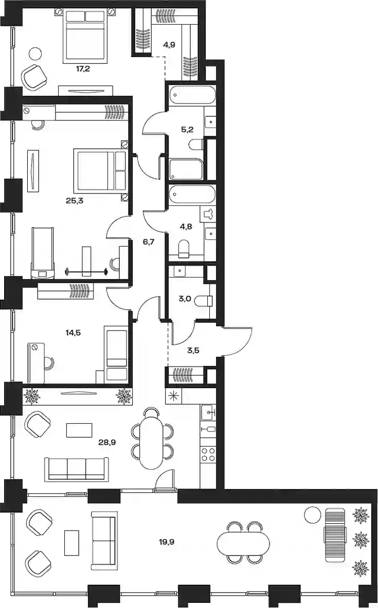 В комплексе предложен широкий выбор планировочных решений от компактных студий площадью 28 кв. метров до просторных пентхаусов с каминами площадью до 156 кв. метров. Также представлены редкие форматы квартир: с террасой, мастер-спальней и окном в ванной комнате. Уникальность проекта заключается в разнообразии типов остекления: в наличии 48 вариантов, включая джабо-окна, французские балконы и эркеры. Высота потолков составляет 3,1 метра, а в пентхаусах достигает 3,6 метра.