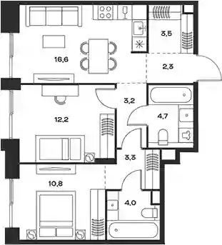 В комплексе предложен широкий выбор планировочных решений от компактных студий площадью 28 кв. метров до просторных пентхаусов с каминами площадью до 156 кв. метров. Также представлены редкие форматы квартир: с террасой, мастер-спальней и окном в ванной комнате. Уникальность проекта заключается в разнообразии типов остекления: в наличии 48 вариантов, включая джабо-окна, французские балконы и эркеры. Высота потолков составляет 3,1 метра, а в пентхаусах достигает 3,6 метра.