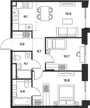 В комплексе предложен широкий выбор планировочных решений от компактных студий площадью 28 кв. метров до просторных пентхаусов с каминами площадью до 156 кв. метров. Также представлены редкие форматы квартир: с террасой, мастер-спальней и окном в ванной комнате. Уникальность проекта заключается в разнообразии типов остекления: в наличии 48 вариантов, включая джабо-окна, французские балконы и эркеры. Высота потолков составляет 3,1 метра, а в пентхаусах достигает 3,6 метра.