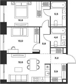 В комплексе предложен широкий выбор планировочных решений от компактных студий площадью 28 кв. метров до просторных пентхаусов с каминами площадью до 156 кв. метров. Также представлены редкие форматы квартир: с террасой, мастер-спальней и окном в ванной комнате. Уникальность проекта заключается в разнообразии типов остекления: в наличии 48 вариантов, включая джабо-окна, французские балконы и эркеры. Высота потолков составляет 3,1 метра, а в пентхаусах достигает 3,6 метра.