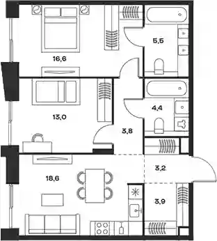 В комплексе предложен широкий выбор планировочных решений от компактных студий площадью 28 кв. метров до просторных пентхаусов с каминами площадью до 156 кв. метров. Также представлены редкие форматы квартир: с террасой, мастер-спальней и окном в ванной комнате. Уникальность проекта заключается в разнообразии типов остекления: в наличии 48 вариантов, включая джабо-окна, французские балконы и эркеры. Высота потолков составляет 3,1 метра, а в пентхаусах достигает 3,6 метра.