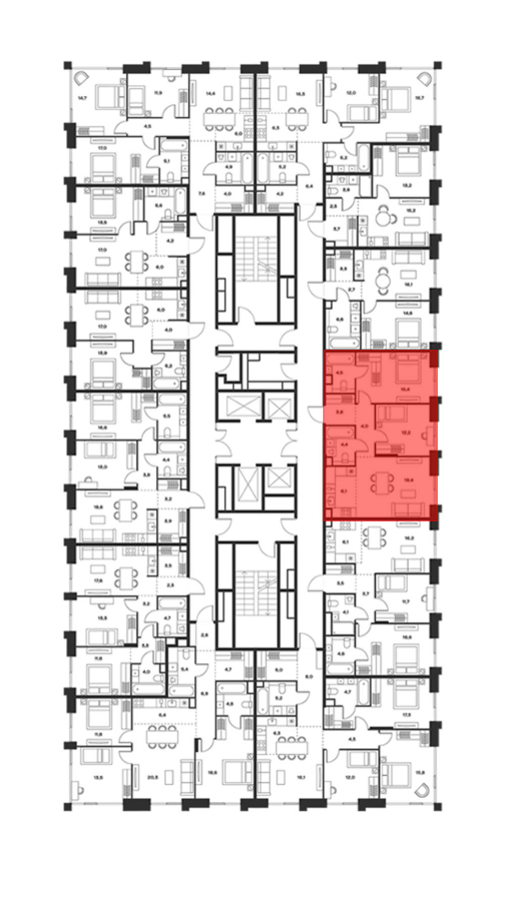 В комплексе предложен широкий выбор планировочных решений от компактных студий площадью 28 кв. метров до просторных пентхаусов с каминами площадью до 156 кв. метров. Также представлены редкие форматы квартир: с террасой, мастер-спальней и окном в ванной комнате. Уникальность проекта заключается в разнообразии типов остекления: в наличии 48 вариантов, включая джабо-окна, французские балконы и эркеры. Высота потолков составляет 3,1 метра, а в пентхаусах достигает 3,6 метра.