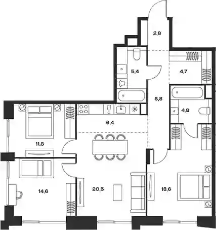 4-к.квартира, 96.2 м², 14 эт. в ЖК Soul Корпус 8