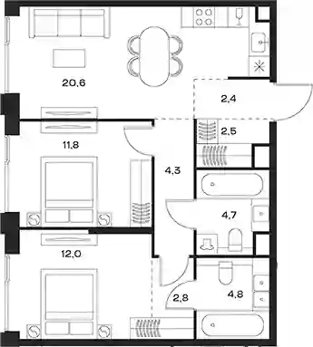 В комплексе предложен широкий выбор планировочных решений от компактных студий площадью 28 кв. метров до просторных пентхаусов с каминами площадью до 156 кв. метров. Также представлены редкие форматы квартир: с террасой, мастер-спальней и окном в ванной комнате. Уникальность проекта заключается в разнообразии типов остекления: в наличии 48 вариантов, включая джабо-окна, французские балконы и эркеры. Высота потолков составляет 3,1 метра, а в пентхаусах достигает 3,6 метра.