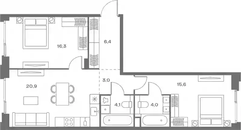 В комплексе предложен широкий выбор планировочных решений от компактных студий площадью 28 кв. метров до просторных пентхаусов с каминами площадью до 156 кв. метров. Также представлены редкие форматы квартир: с террасой, мастер-спальней и окном в ванной комнате. Уникальность проекта заключается в разнообразии типов остекления: в наличии 48 вариантов, включая джабо-окна, французские балконы и эркеры. Высота потолков составляет 3,1 метра, а в пентхаусах достигает 3,6 метра.