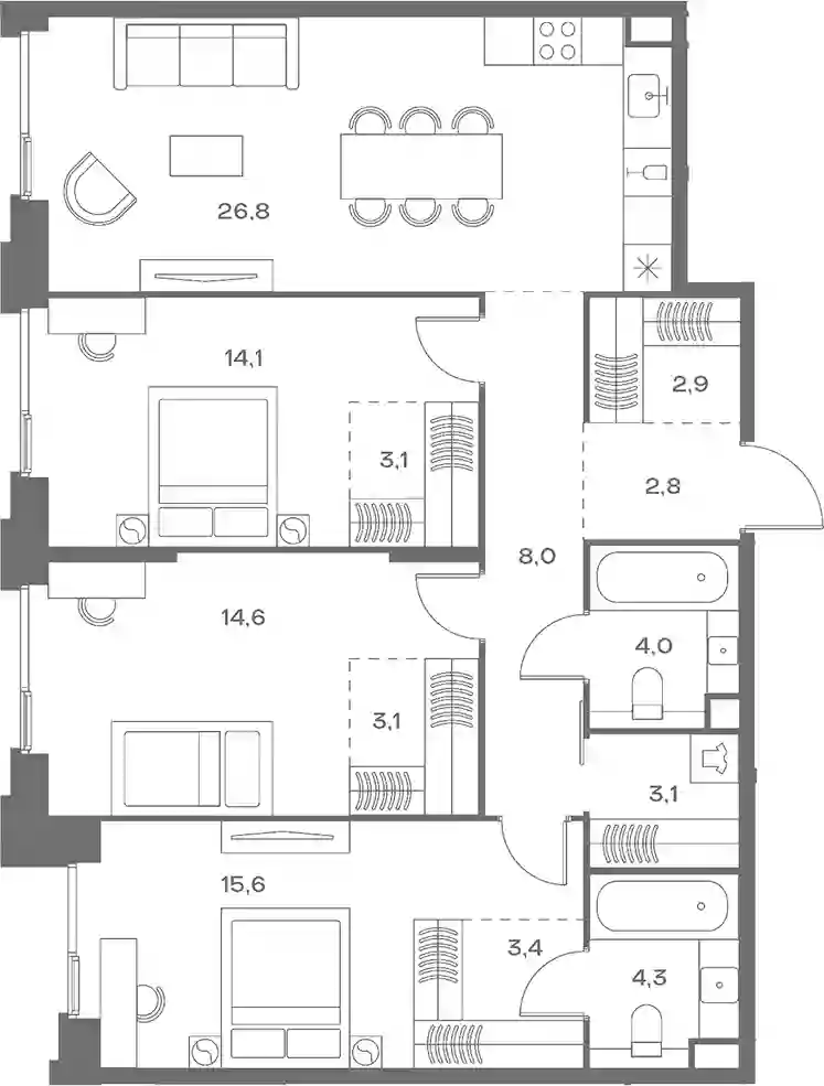 В комплексе предложен широкий выбор планировочных решений от компактных студий площадью 28 кв. метров до просторных пентхаусов с каминами площадью до 156 кв. метров. Также представлены редкие форматы квартир: с террасой, мастер-спальней и окном в ванной комнате. Уникальность проекта заключается в разнообразии типов остекления: в наличии 48 вариантов, включая джабо-окна, французские балконы и эркеры. Высота потолков составляет 3,1 метра, а в пентхаусах достигает 3,6 метра.
