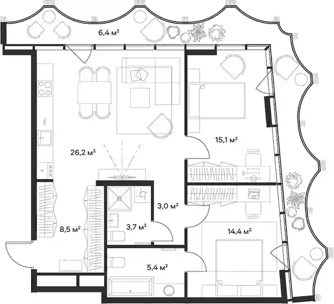 В комплексе предложен широкий выбор планировочных решений от студий до 5-ти комнатных квартир. Также доступны уникальные форматы: квартиры с панорамными гостиными и террасами. Все квартиры сдаются без стен, что открывает возможности для индивидуального оформления. Высота потолков составляет 2,8 метра, а окна — панорамные и увеличенные.