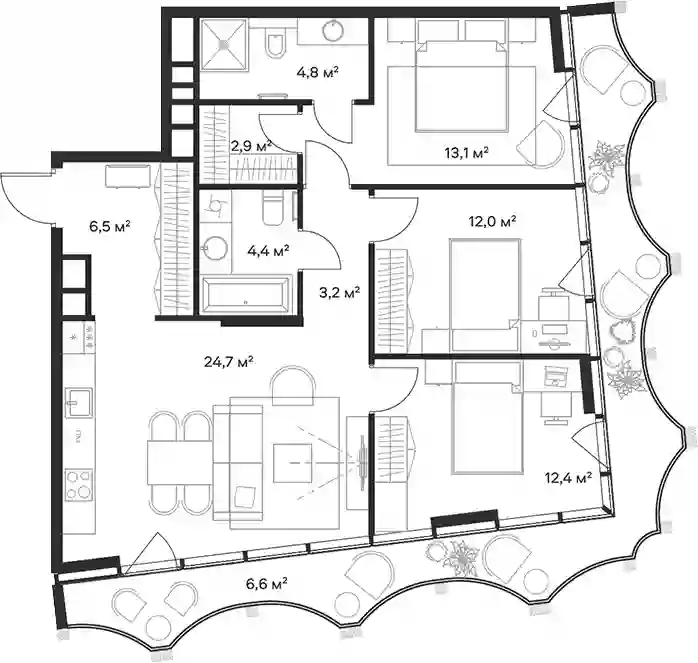 В комплексе предложен широкий выбор планировочных решений от студий до 5-ти комнатных квартир. Также доступны уникальные форматы: квартиры с панорамными гостиными и террасами. Все квартиры сдаются без стен, что открывает возможности для индивидуального оформления. Высота потолков составляет 2,8 метра, а окна — панорамные и увеличенные.