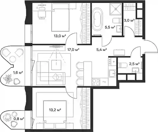 В комплексе предложен широкий выбор планировочных решений от студий до 5-ти комнатных квартир. Также доступны уникальные форматы: квартиры с панорамными гостиными и террасами. Все квартиры сдаются без стен, что открывает возможности для индивидуального оформления. Высота потолков составляет 2,8 метра, а окна — панорамные и увеличенные.