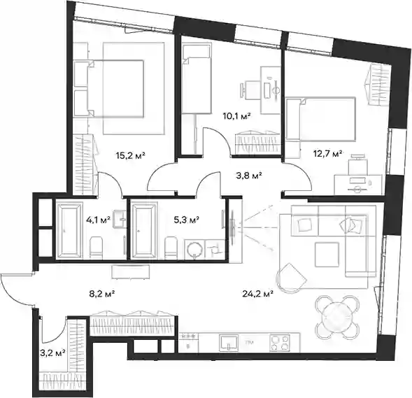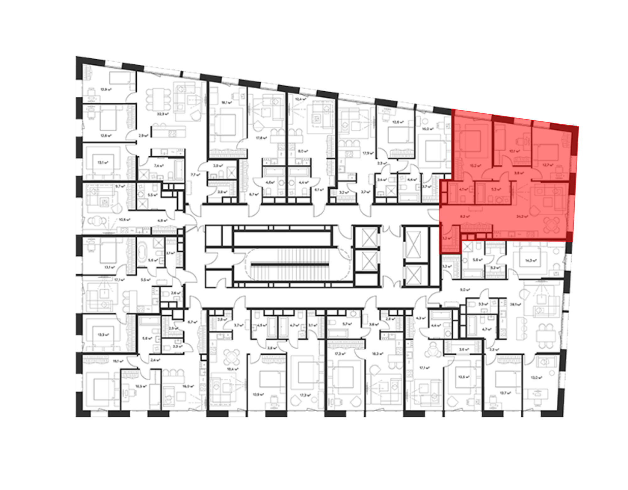 В комплексе предложен широкий выбор планировочных решений от студий до 5-ти комнатных квартир. Также доступны уникальные форматы: квартиры с панорамными гостиными и террасами. Все квартиры сдаются без стен, что открывает возможности для индивидуального оформления. Высота потолков составляет 2,8 метра, а окна — панорамные и увеличенные.