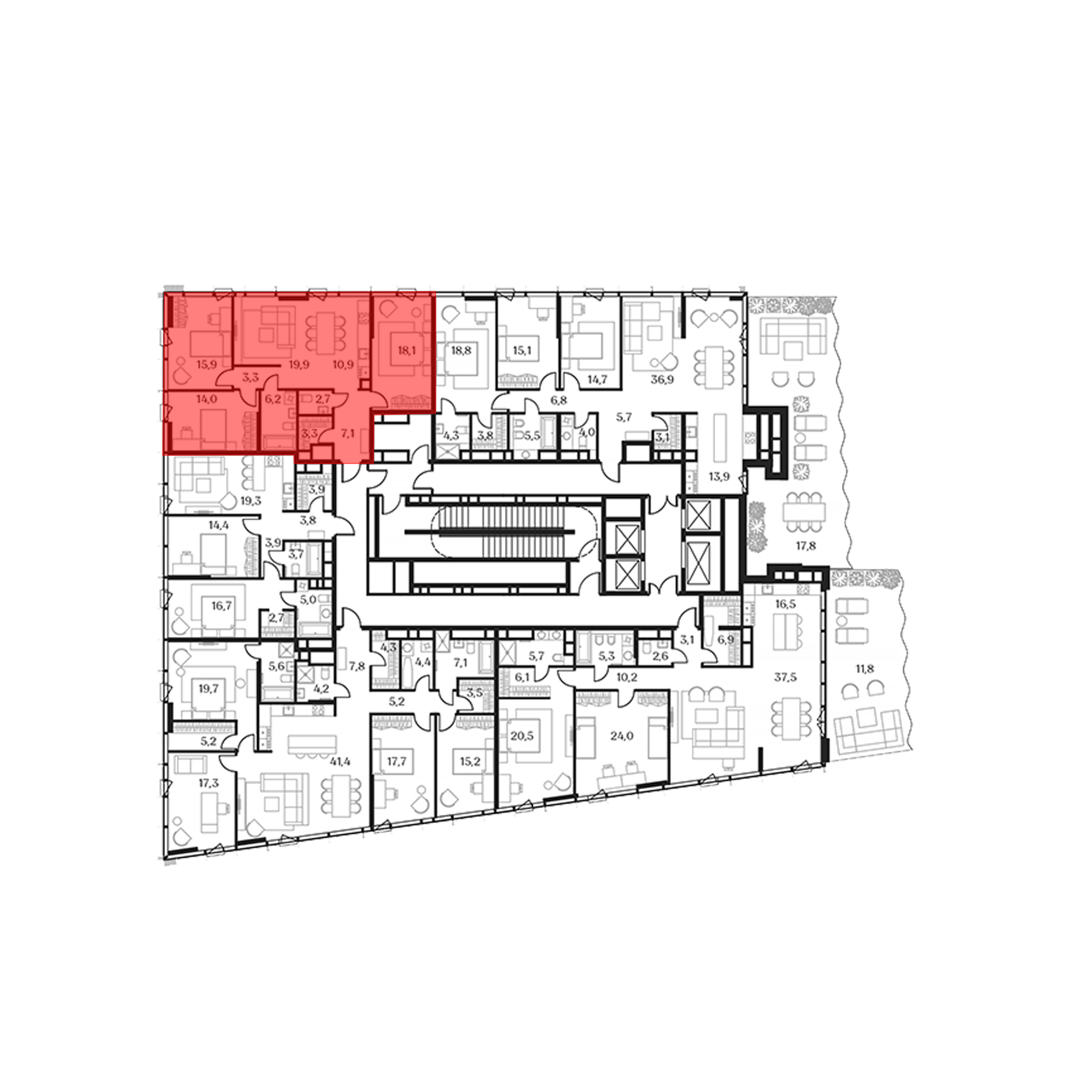 В жилом кластере «Союз» предложено 27 видов планировочных решений площадью от 29,4 до 186 кв. метров, включая квартиры с террасами, мастер спальней и просторные пентхаусы на трех последних этажах. Сдаются они без отделки, с высокими потолками от 3,02 до 4 метров. Большинство квартир спроектировано с входом «на свет». В каждой квартире предусмотрены балконы: на нижних этажах— французские, до 1,5 кв. метров, на верхних — торцевые, с прозрачным остеклением и реечным ограждением.