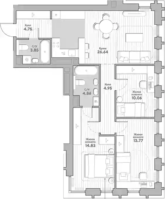 В жилом комплексе представлен широкий выбор планировок: от компактных студий до просторных 4-комнатных квартир. Среди них есть варианты с рабочими кабинетами, детскими, мастер-спальнями и несколькими ванными комнатами. Есть квартиры с увеличенной высотой потолков на последних этажах и лоты с видами на несколько сторон света. Все квартиры сдаются с отделкой White box.