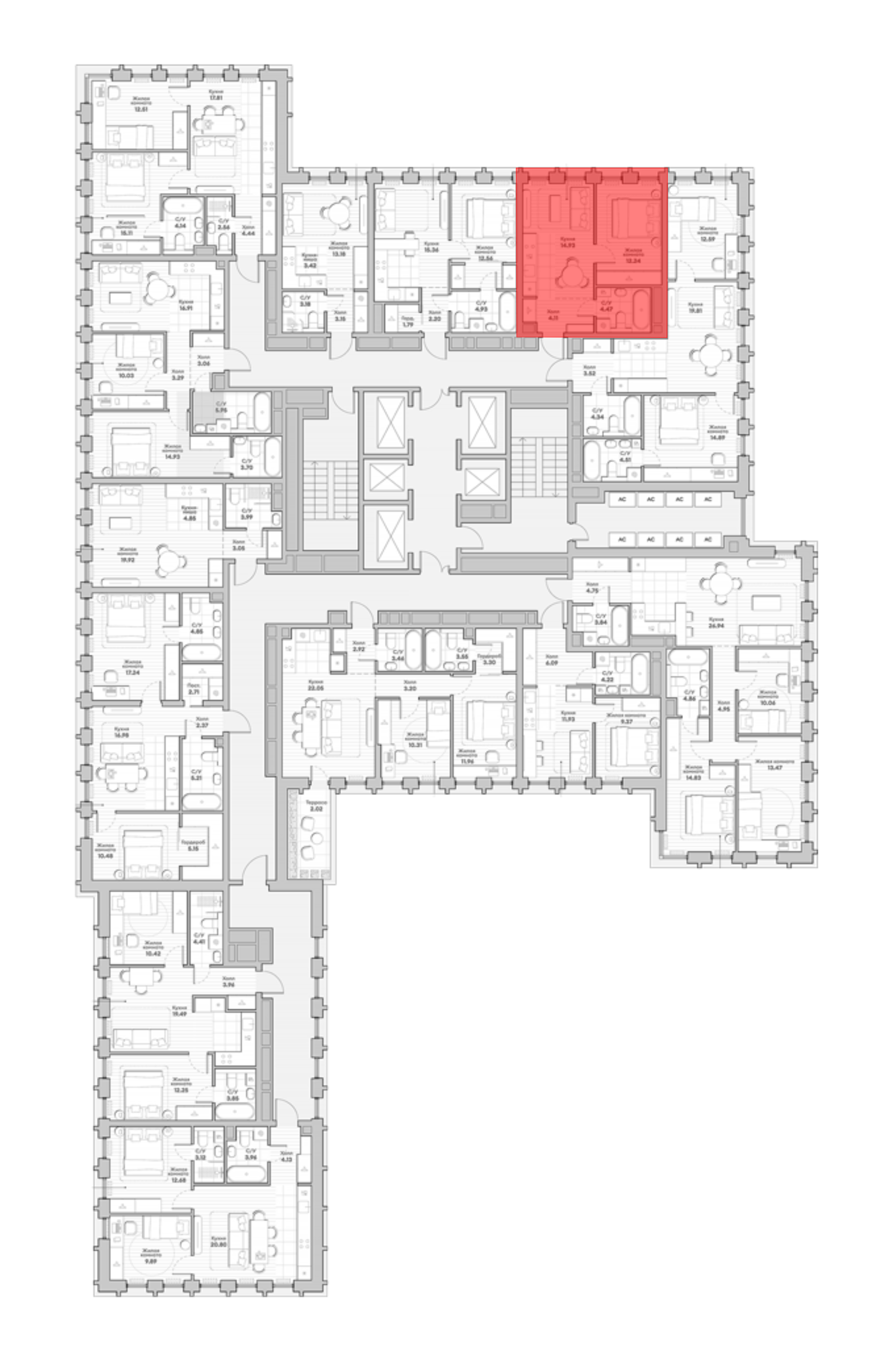 В жилом комплексе представлен широкий выбор планировок: от компактных студий до просторных 4-комнатных квартир. Среди них есть варианты с рабочими кабинетами, детскими, мастер-спальнями и несколькими ванными комнатами. Есть квартиры с увеличенной высотой потолков на последних этажах и лоты с видами на несколько сторон света. Все квартиры сдаются с отделкой White box.