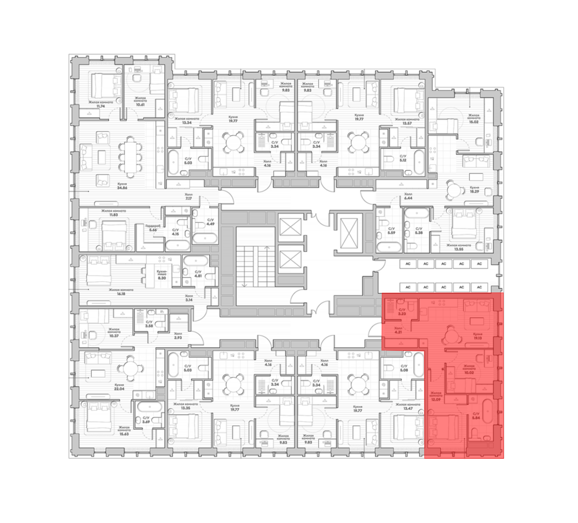 В жилом комплексе представлен широкий выбор планировок: от компактных студий до просторных 4-комнатных квартир. Среди них есть варианты с рабочими кабинетами, детскими, мастер-спальнями и несколькими ванными комнатами. Есть квартиры с увеличенной высотой потолков на последних этажах и лоты с видами на несколько сторон света. Все квартиры сдаются с отделкой White box.