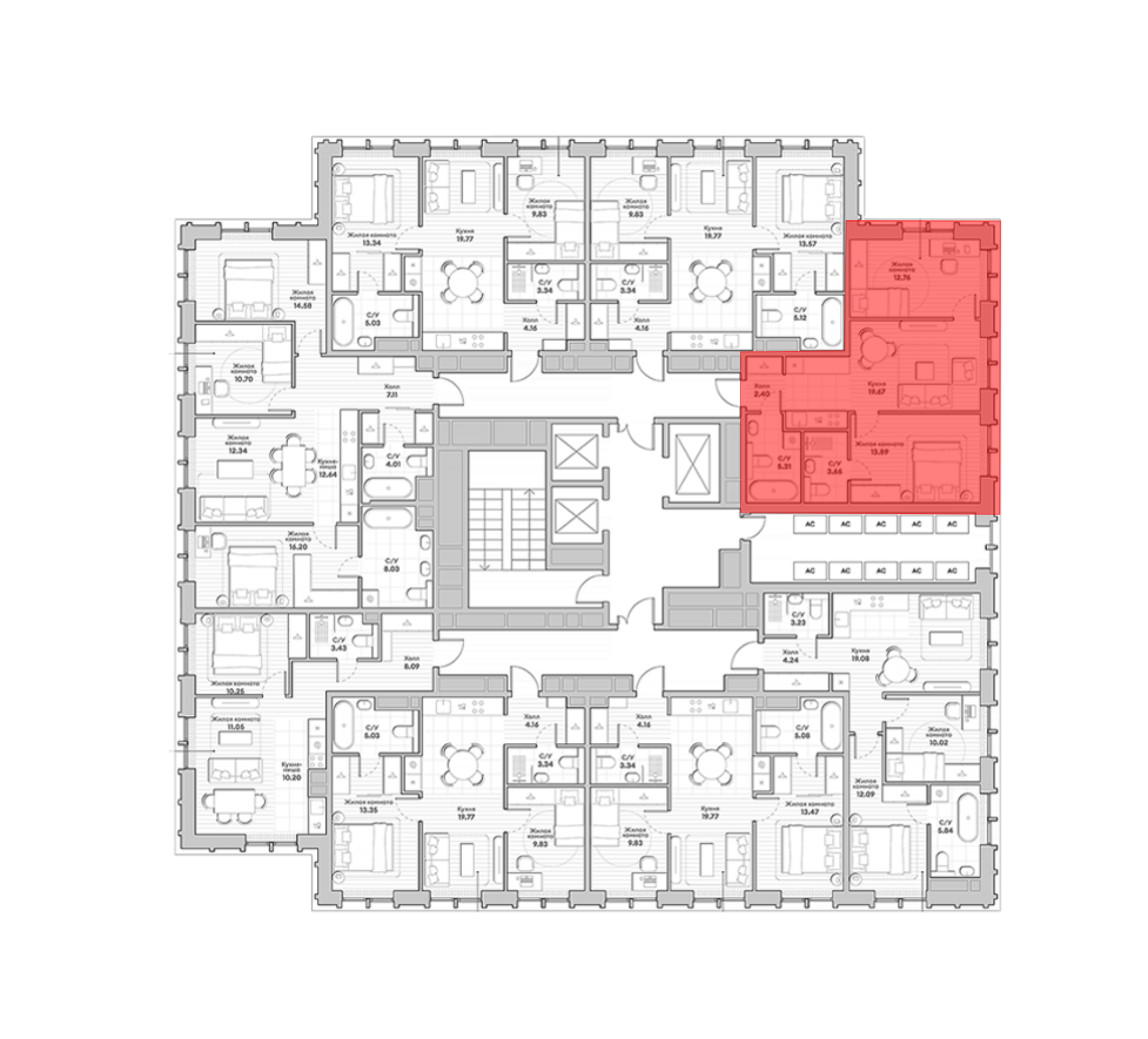 В жилом комплексе представлен широкий выбор планировок: от компактных студий до просторных 4-комнатных квартир. Среди них есть варианты с рабочими кабинетами, детскими, мастер-спальнями и несколькими ванными комнатами. Есть квартиры с увеличенной высотой потолков на последних этажах и лоты с видами на несколько сторон света. Все квартиры сдаются с отделкой White box.