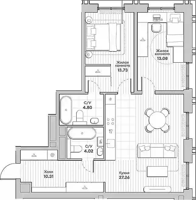 В жилом комплексе представлен широкий выбор планировок: от компактных студий до просторных 4-комнатных квартир. Среди них есть варианты с рабочими кабинетами, детскими, мастер-спальнями и несколькими ванными комнатами. Есть квартиры с увеличенной высотой потолков на последних этажах и лоты с видами на несколько сторон света. Все квартиры сдаются с отделкой White box.