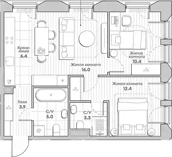 В жилом комплексе представлен широкий выбор планировок: от компактных студий до просторных 4-комнатных квартир. Среди них есть варианты с рабочими кабинетами, детскими, мастер-спальнями и несколькими ванными комнатами. Есть квартиры с увеличенной высотой потолков на последних этажах и лоты с видами на несколько сторон света. Все квартиры сдаются с отделкой White box.