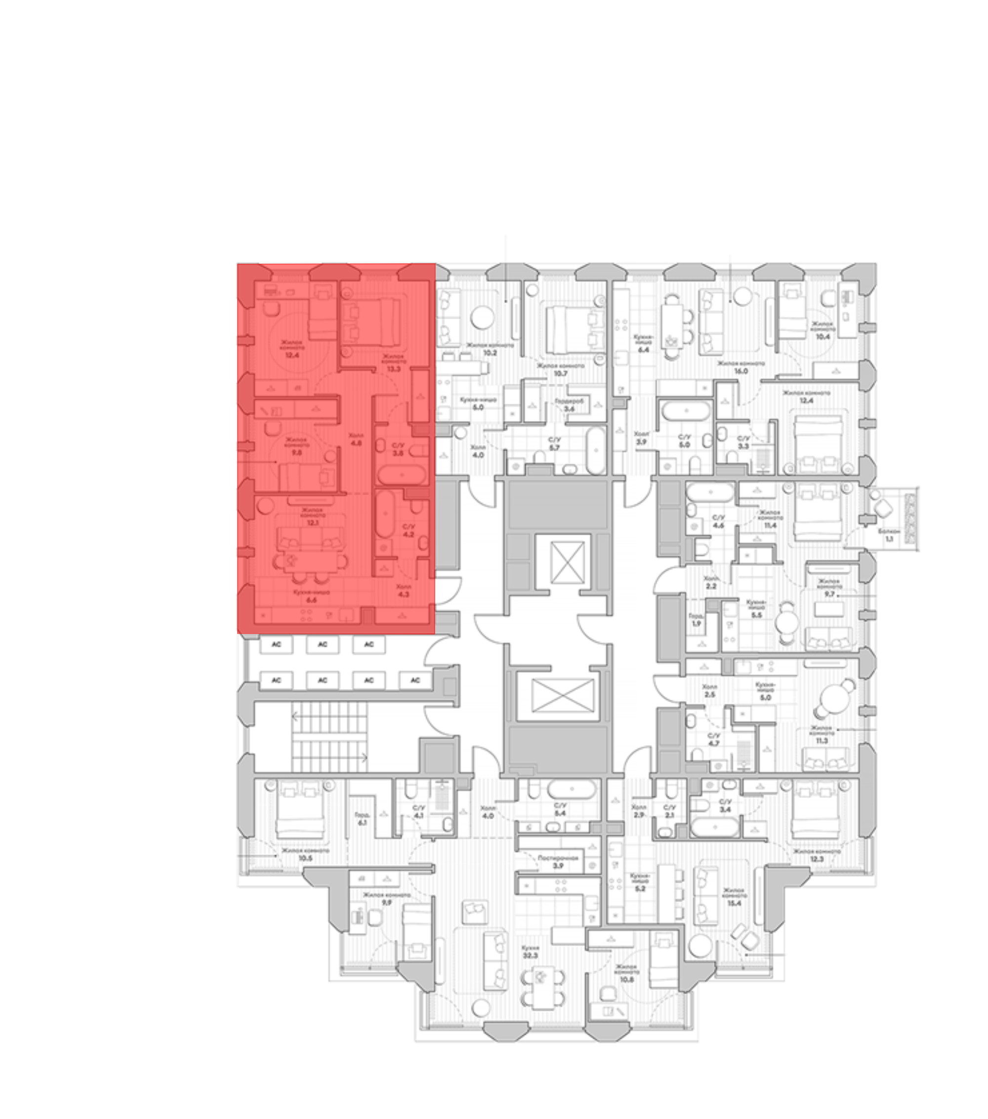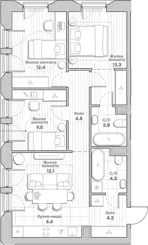 Квартирография жилого комплекса предлагает широкий выбор планировок: от уютных студий до просторных многокомнатных квартир с террасами, мастер-спальнями, несколькими ванными комнатами, гардеробными и постирочными. Из квартир с лоджиями, французскими балконами, открытыми террасами или угловым остеклением открываются панорамные виды на город. Все квартиры сдаются с отделкой White box. Высота потолков в квартирах составляет 2,92 метра на типовом этаже и 3,20 метра на верхних этажах.