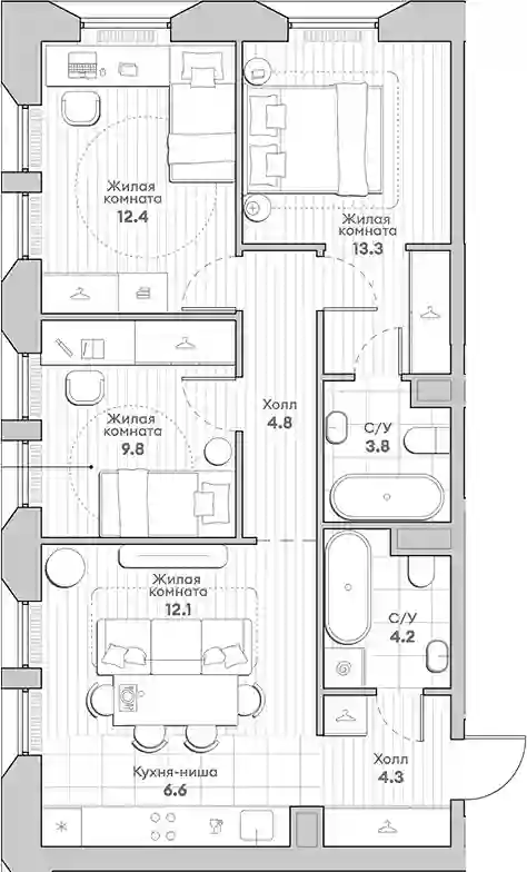 Квартирография жилого комплекса предлагает широкий выбор планировок: от уютных студий до просторных многокомнатных квартир с террасами, мастер-спальнями, несколькими ванными комнатами, гардеробными и постирочными. Из квартир с лоджиями, французскими балконами, открытыми террасами или угловым остеклением открываются панорамные виды на город. Все квартиры сдаются с отделкой White box. Высота потолков в квартирах составляет 2,92 метра на типовом этаже и 3,20 метра на верхних этажах.