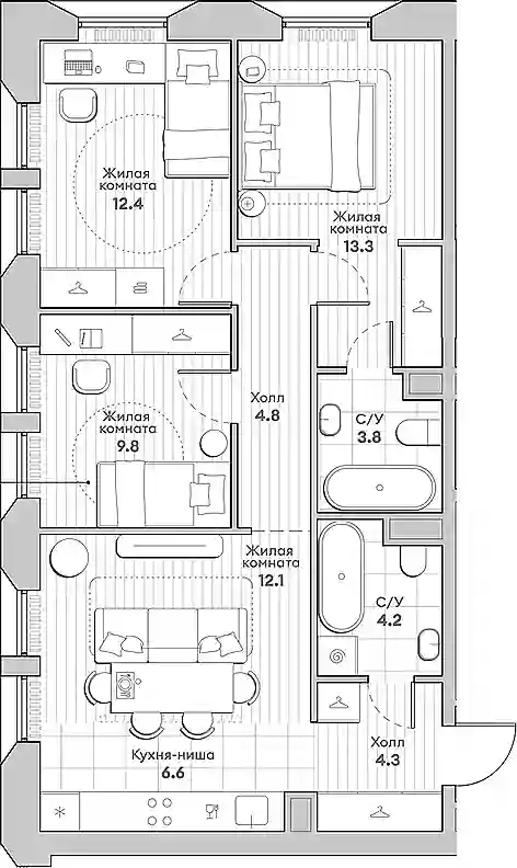 В жилом комплексе представлен широкий выбор планировок: от компактных студий до просторных 4-комнатных квартир. Среди них есть варианты с рабочими кабинетами, детскими, мастер-спальнями и несколькими ванными комнатами. Есть квартиры с увеличенной высотой потолков на последних этажах и лоты с видами на несколько сторон света. Все квартиры сдаются с отделкой White box.