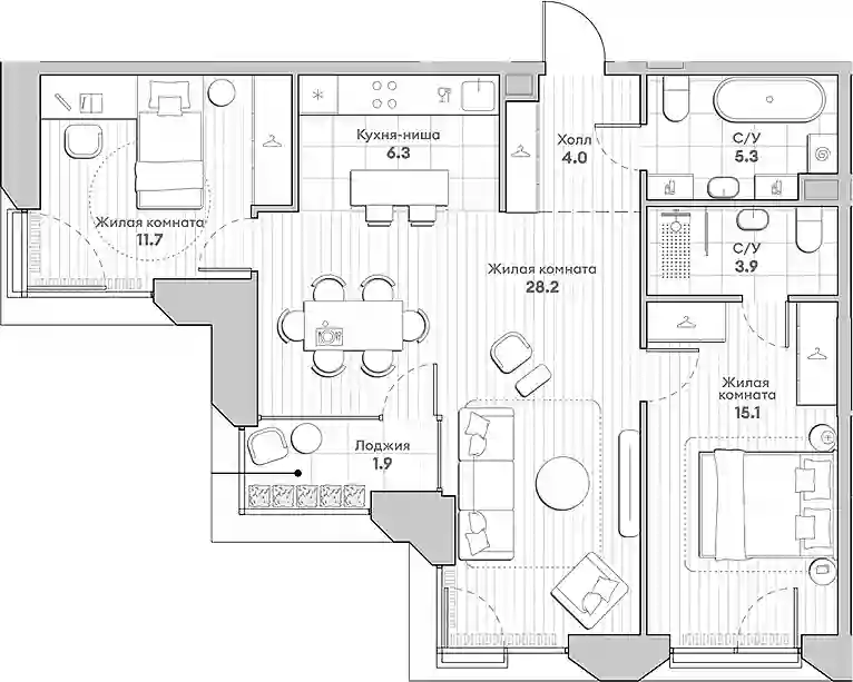 Квартирография жилого комплекса предлагает широкий выбор планировок: от уютных студий до просторных многокомнатных квартир с террасами, мастер-спальнями, несколькими ванными комнатами, гардеробными и постирочными. Из квартир с лоджиями, французскими балконами, открытыми террасами или угловым остеклением открываются панорамные виды на город. Все квартиры сдаются с отделкой White box. Высота потолков в квартирах составляет 2,92 метра на типовом этаже и 3,20 метра на верхних этажах.