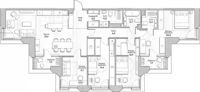 В жилом комплексе представлен широкий выбор планировок: от компактных студий до просторных 4-комнатных квартир. Среди них есть варианты с рабочими кабинетами, детскими, мастер-спальнями и несколькими ванными комнатами. Есть квартиры с увеличенной высотой потолков на последних этажах и лоты с видами на несколько сторон света. Все квартиры сдаются с отделкой White box.