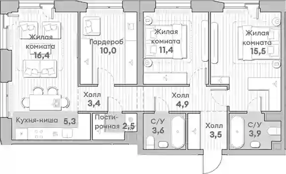 В жилом комплексе представлен широкий выбор планировок: от компактных студий до просторных 4-комнатных квартир. Среди них есть варианты с рабочими кабинетами, детскими, мастер-спальнями и несколькими ванными комнатами. Есть квартиры с увеличенной высотой потолков на последних этажах и лоты с видами на несколько сторон света. Все квартиры сдаются с отделкой White box.