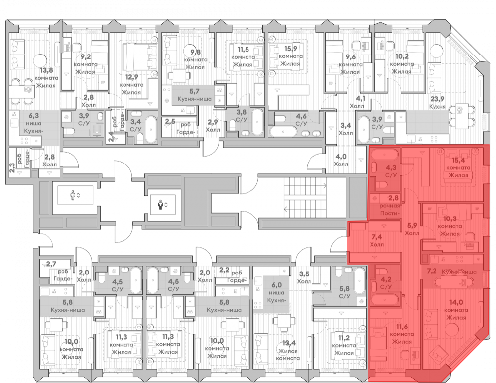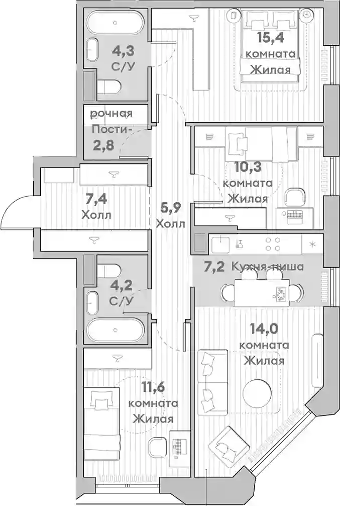 Квартирография жилого комплекса предлагает широкий выбор планировок: от уютных студий до просторных многокомнатных квартир с террасами, мастер-спальнями, несколькими ванными комнатами, гардеробными и постирочными. Из квартир с лоджиями, французскими балконами, открытыми террасами или угловым остеклением открываются панорамные виды на город. Все квартиры сдаются с отделкой White box. Высота потолков в квартирах составляет 2,92 метра на типовом этаже и 3,20 метра на верхних этажах.