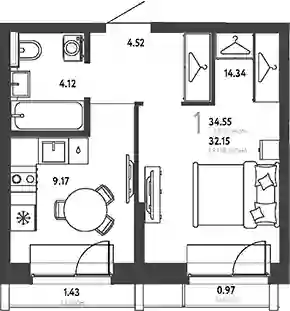 9 680 000 ₽1-к.квартира, 34.85 м², 14 эт.