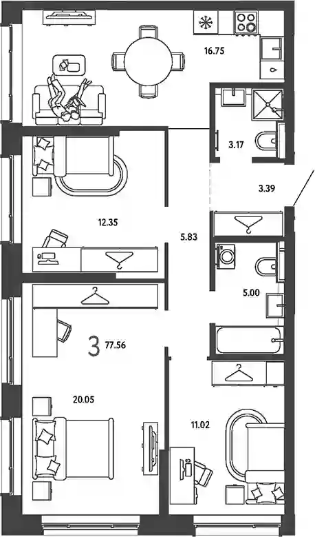 3-к.квартира, 77.56 м², 20 эт. в ЖК Страна.Парковая Корпус Васнецов 3