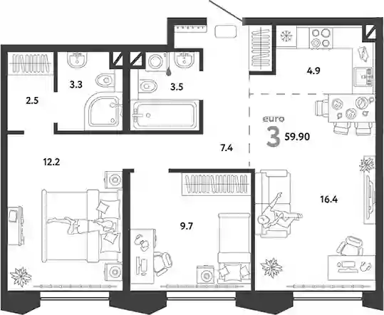 3-к.квартира, 59.9 м², 30 эт. в ЖК Страна.Озерная Корпус Дом Байкал