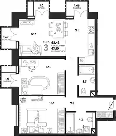 3-к.квартира, 63.1 м², 7 эт. в ЖК Страна.Озерная Корпус Дом Байкал