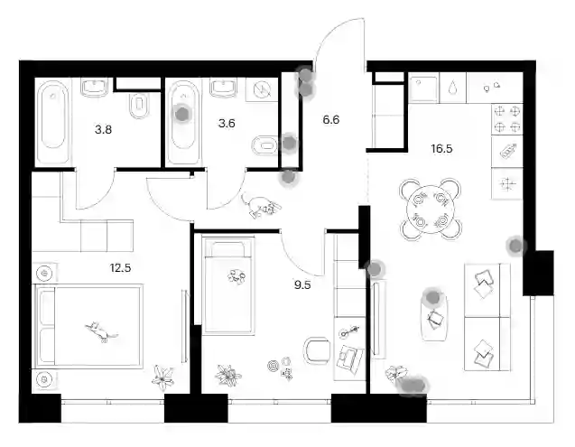 В проекте представлены студии и квартиры с 1–3 спальнями. В некоторых вариантах предусмотрены мастер-спальни, гардеробные, выделенные помещения под постирочную. В помещениях установлены увеличенные, панорамные и окна в пол. Высота потолков составляет 2,76–3,22 м. Доступны 3 варианта отделки: чистовая, подчистовая и без стен. Дополнительно реализована система умного дома в квартирах корпуса 1.1.3. На выбор доступны квартиры с балконом или видовой террасой.