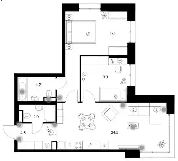 В проекте представлены студии и квартиры с 1–3 спальнями. В некоторых вариантах предусмотрены мастер-спальни, гардеробные, выделенные помещения под постирочную. В помещениях установлены увеличенные, панорамные и окна в пол. Высота потолков составляет 2,76–3,22 м. Доступны 3 варианта отделки: чистовая, подчистовая и без стен. Дополнительно реализована система умного дома в квартирах корпуса 1.1.3. На выбор доступны квартиры с балконом или видовой террасой.