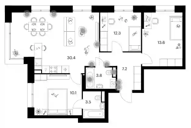 В проекте представлены студии и квартиры с 1–3 спальнями. В некоторых вариантах предусмотрены мастер-спальни, гардеробные, выделенные помещения под постирочную. В помещениях установлены увеличенные, панорамные и окна в пол. Высота потолков составляет 2,76–3,22 м. Доступны 3 варианта отделки: чистовая, подчистовая и без стен. Дополнительно реализована система умного дома в квартирах корпуса 1.1.3. На выбор доступны квартиры с балконом или видовой террасой.