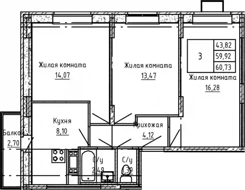 В проекте предлагаются планировочные решения для различных сценариев жизни: от компактных 1-комнатных до просторных 3-комнатных квартир площадью от 30 до 64 кв. м. Помещения оснащены стандартными окнами, высота потолков составляет 2,75 м.