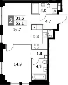 38 522 740 ₽2-к.квартира, 52.1 м², 6 эт.