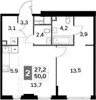 27 234 109 ₽2-к.квартира, 49.7 м², 3 эт.