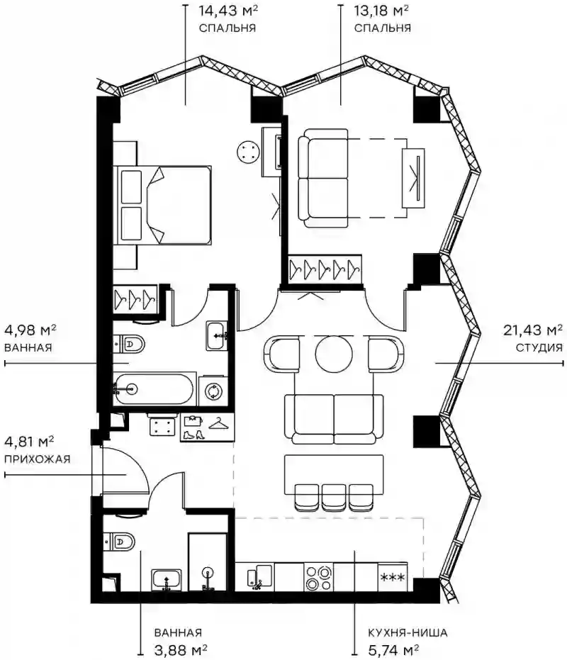 В комплексе предложено множество планировочных решений: в наличии квартиры, как классического типа, так и европланировки. Квартиры сдаются с подчистовой отделкой, высотой потолков 3 м и панорамным остеклением в пол.