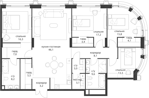 В комплексе предложен большой выбор элитных лотов: от функциональных однокомнатных квартир до семейных резиденций и пентхаусов со вторым светом. Есть и редкие форматы: с окнами в ванных, молированным угловым остеклением, возможностью установки камина. В квартирах спроектированы панорамные окна «в пол» и двухстворчатые двери. В более чем 50% квартир предусмотрены террасы, лоджии и балконы. Квартиры сдаются без отделки и внутренних перегородок.