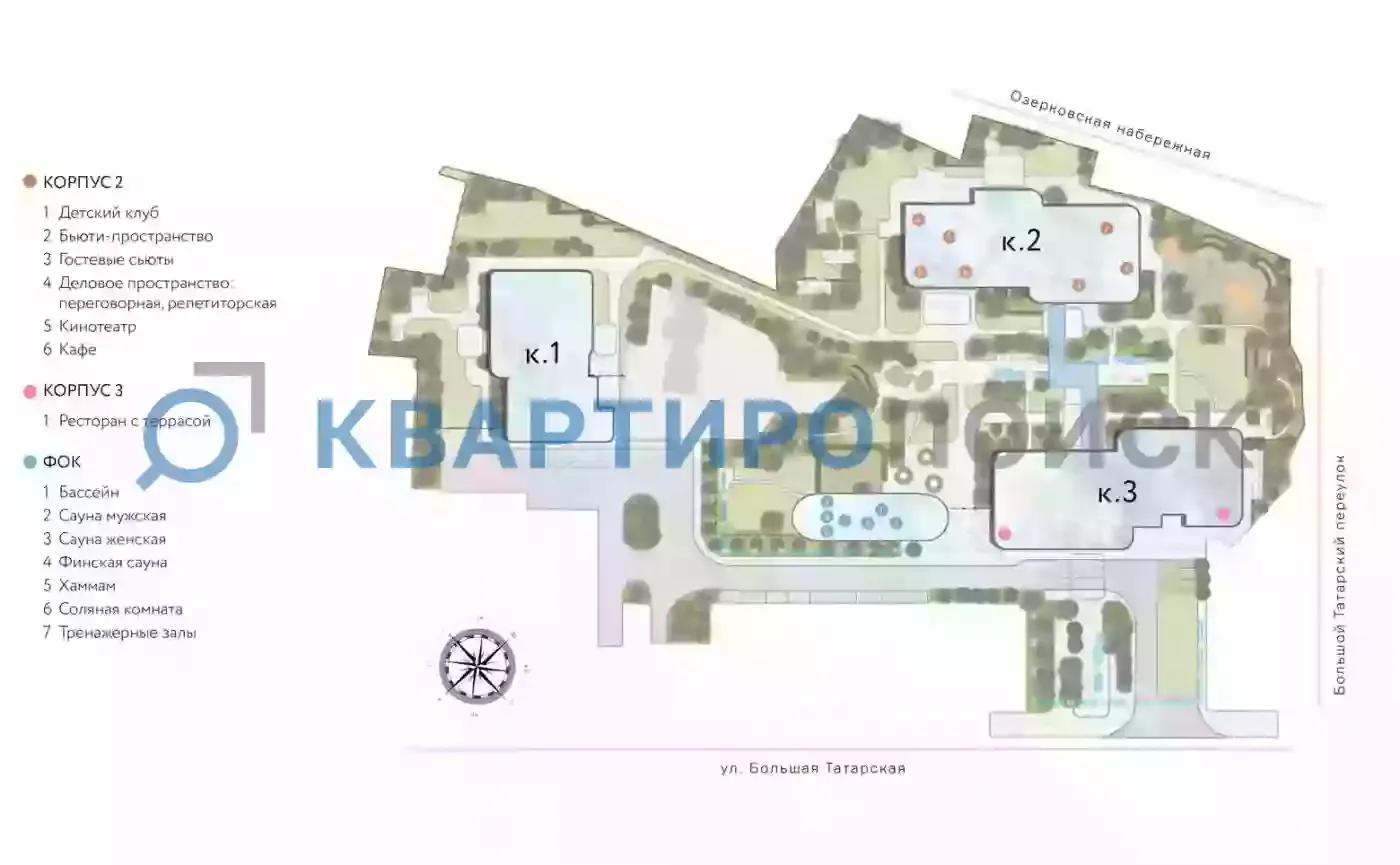 Только для жителей на территории предусмотрен трехуровневый фитнес-центр с бассейном, залом для групповых занятий, тренажерным залом, хаммамом и массажным кабинетом. Комплекс имеет благоустроенный зеленый двор площадью 1,8 гектара. В нем размещены фонтаны, патио, галерея, лаунжи, зеленые кабинеты и событийная площадь. Для детей оборудованы современные игровые площадки. На двух подземных этажах предусмотрены двухуровневый паркинг с возможностью установки зарядки для электрокаров, зоны для хранения колясок и велосипедов, кладовые помещения для сезонных вещей.
